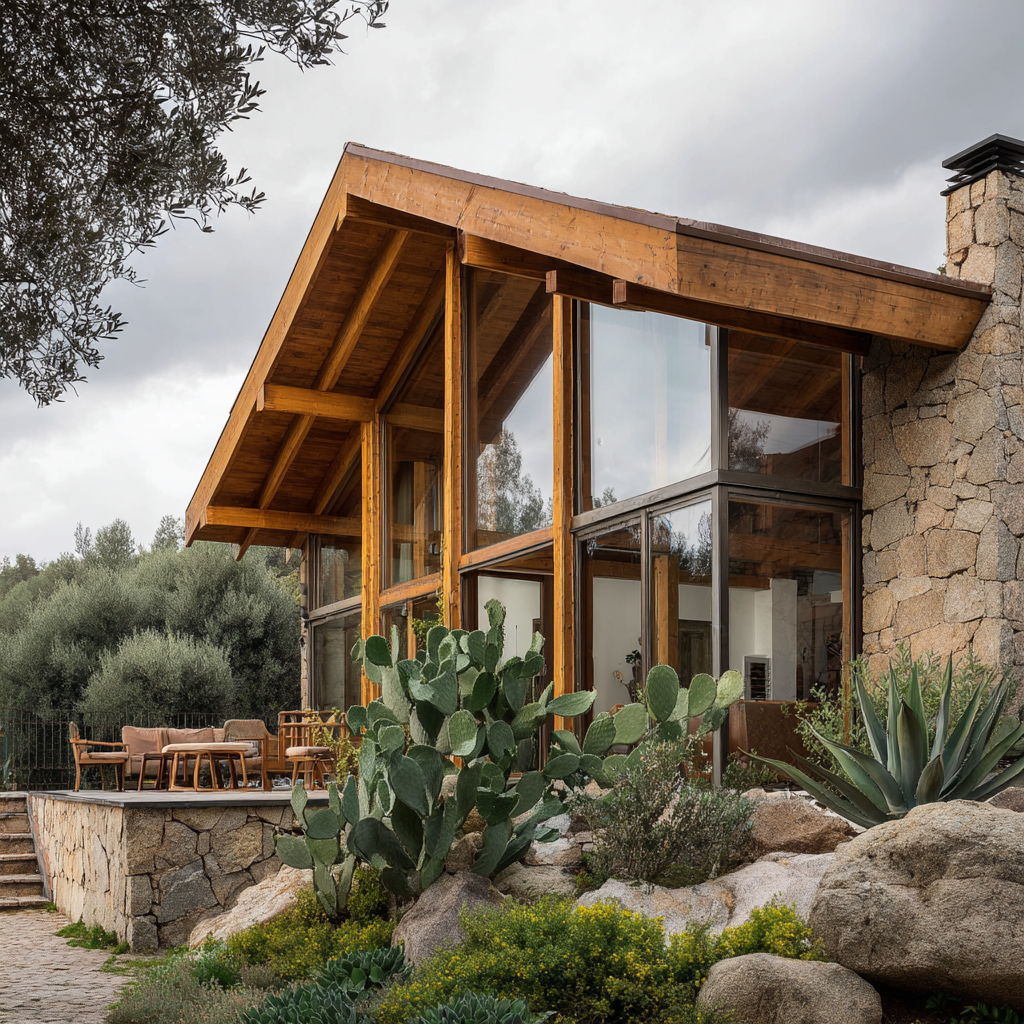 Casa de madera en la Sierra, con tejado a dos aguas y una fachada completa de cristal en uno de sus frentes para capturar las vistas; paisajismo que respeta la vegetación existente, mobiliario exterior a medida y una zona seca de cactus de bajo mantenimiento, con riego inteligente e iluminación solar integrada.