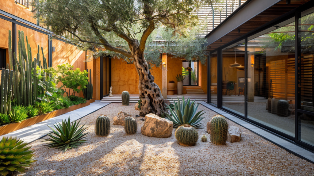Jardín interior con olivo protagonista y composición de cactus: un patio luminoso y escultórico que aporta calma, luz y carácter mediterráneo, con especies de bajo mantenimiento, grava y piedra natural para un ambiente limpio, resistente y pensado para disfrutarse todo el año.